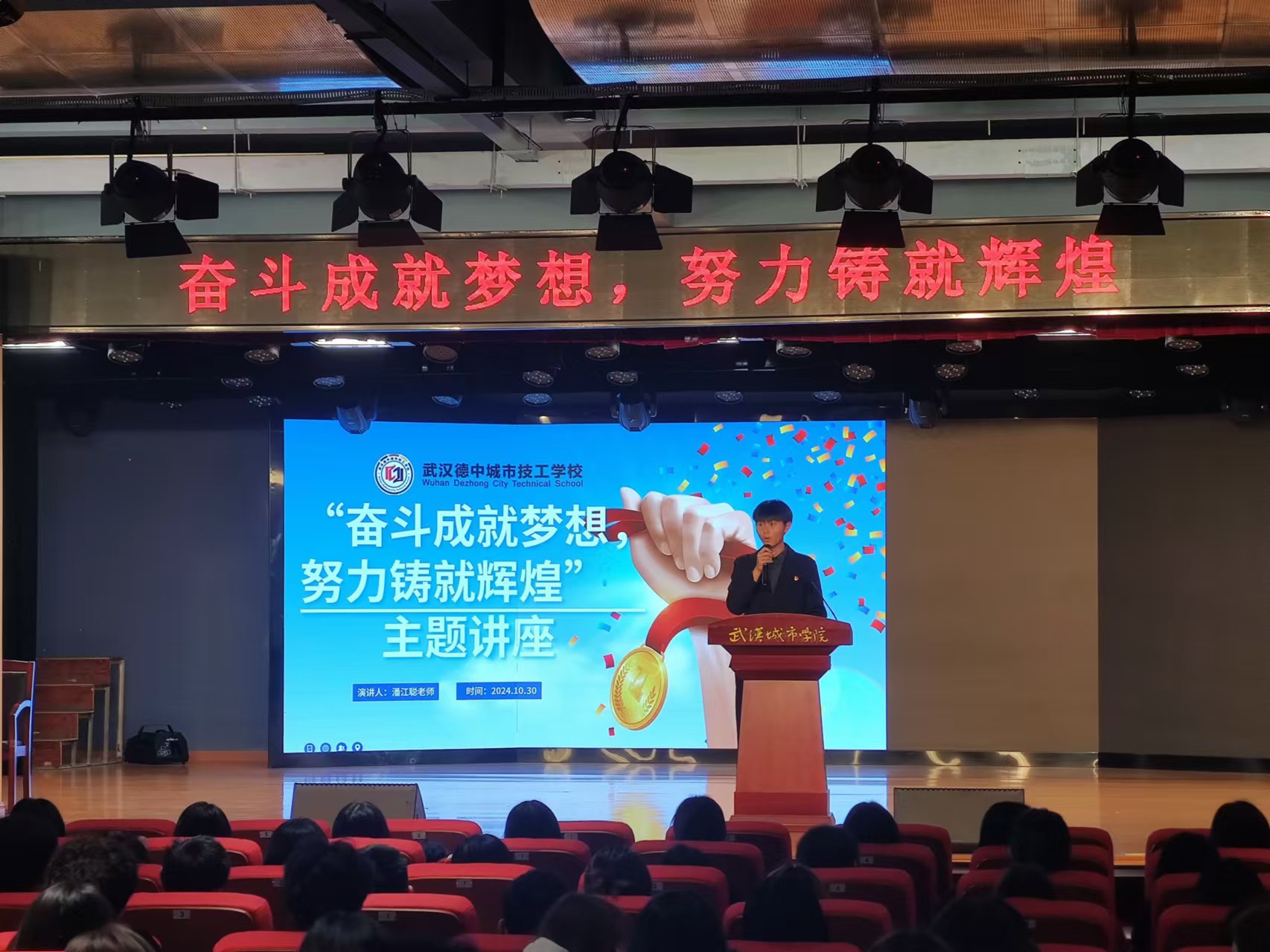 2024年10月30日下午,学校在大礼堂举办了一场由全校学生参加的 “奋斗成就梦想,努力铸就辉煌” 的主题报告会。潘江聪老师给大家作了自己是如何从一名中职学生成为一名中职教师的主题报告。报告内容精彩,与我们的实际切合,使我们深受教育。